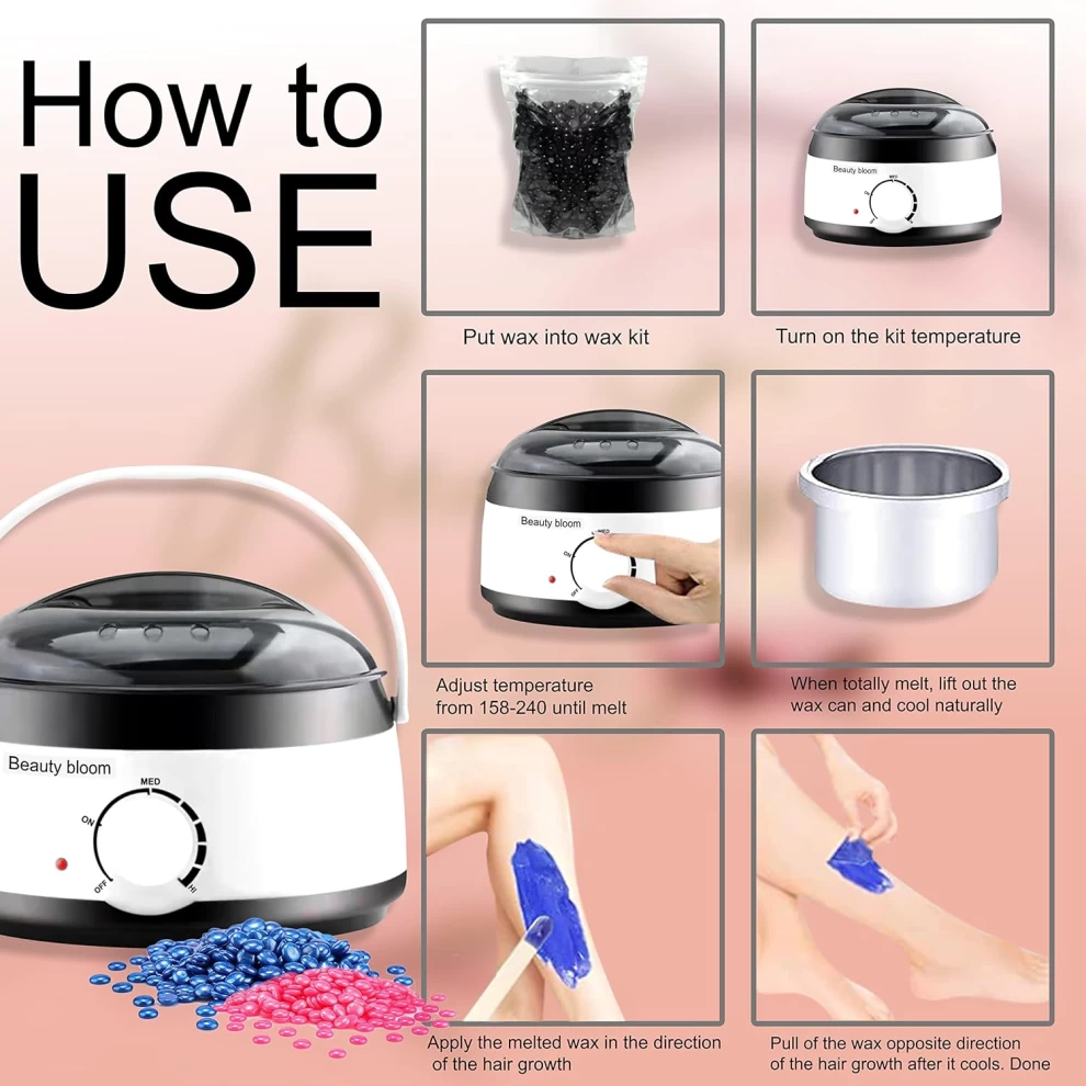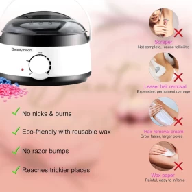 استمتعِ بتجربة إزالة الشعر في منزلك بسهولة، أمان، وفعالية! جهاز تسخين الشمع المتكامل هذا مناسب للنساء والرجال، ويشمل كل ما تحتاجينه لجلسة شمع مريحة وسريعة على الوجه أو الجسم.