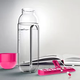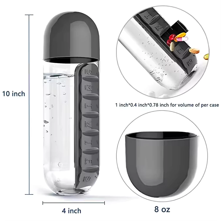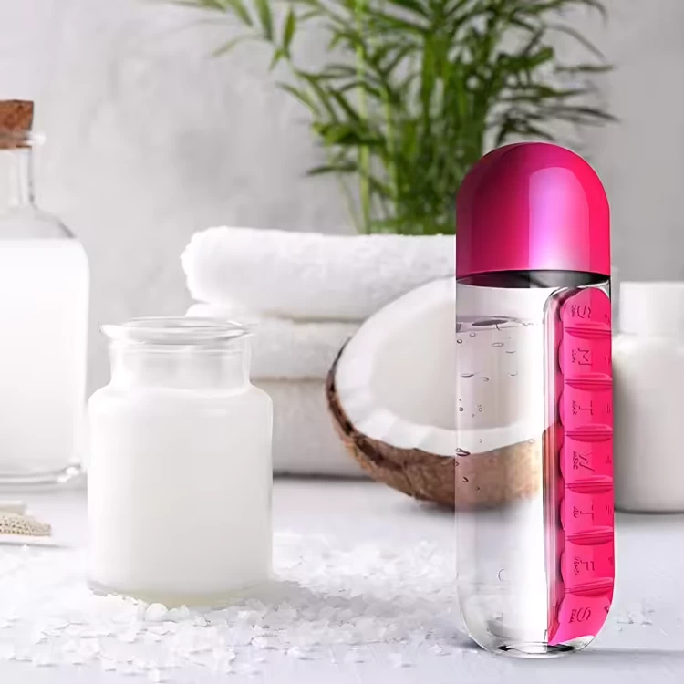 🥤 تصميم 2 في 1 – زجاجة ماء مع علبة حبوب مدمجة.