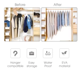 • مجموعة واسعة من الاستخدامات: تعتبر حقائب التخزين الخاصة بنا ضرورية للأثاث، فهي تحمي ملابسك الثمينة من الغبار والأوساخ، وهي مثالية للبدلات والفساتين والمعاطف والسترات وما إلى ذلك. إنها مثالية للتخزين في الشتاء والصيف، ومناسبة للسفر ورحلات العمل والمنزل والمناسبات الأخرى، وتوفر الحماية لك ولملابس عائلتك الثمينة.