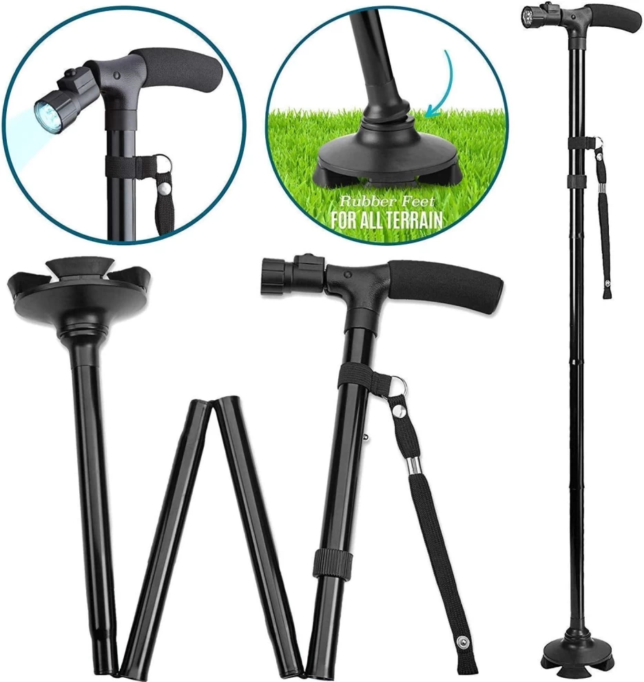 🦯 عصا مشي قابلة للطي مع ضوء LED – خفيفة الوزن، قابلة للتعديل وقابلة للطي