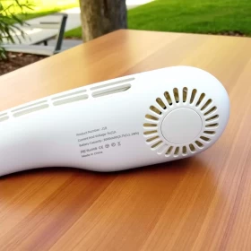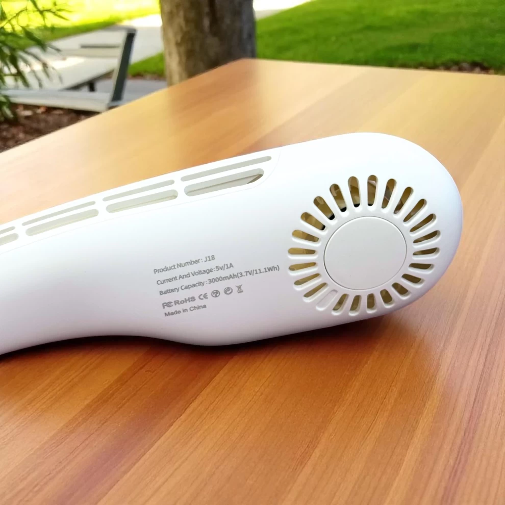 مروحة J18 معلقة للرقبة مع شاشة رقمية بدون شفرات (أبيض)