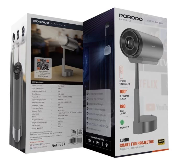 حوّل أي مكان إلى سينما منزلية مع بروجكتر بورودو لايف ستايل لوميو الذكي. يتميز بدقة FHD 1080p مع اتصال ذكي وصوت مدمج، ليمنحك تجربة مشاهدة استثنائية للأفلام، الألعاب، والعروض التقديمية. مثالي لمحبي الترفيه العائلي والذين يبحثون عن شاشة كبيرة في أي وقت وأي مكان.