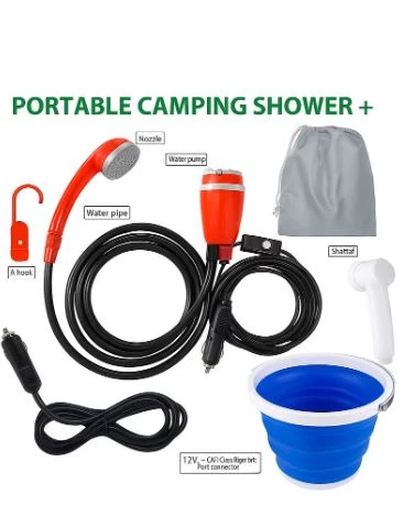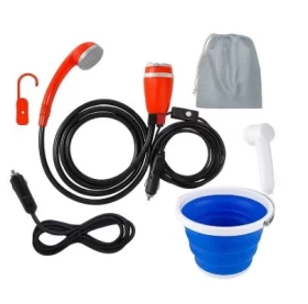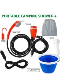 دش ومشطاف متنقل للتخييم – طقم شطاف سفر 12 فولت مع دلو قابل للطي