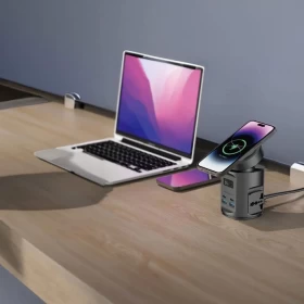 اشحن أجهزتك بكفاءة مع محور شحن Powerology MagSafe، المصمم لأجهزة iPhone المتوافقة مع MagSafe وغيرها. يتميز بمنفذ USB-C Power Delivery ومنفذ USB-A Quick Charge 3.0 لتوفير شحن سريع وآمن وفعال لعدة أجهزة في وقت واحد، مثالي للاستخدام المنزلي والمكتبي والسفر.