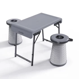 استمتع برحلاتك الخارجية براحة وأناقة مع طقم الطاولة المحمولة من بورودو المزود بمقاعد قابلة للطي مزودة بإضاءة LED تمنحك رؤية واضحة في الليل. مثالي للتخييم، الرحلات، الشاطئ، والحدائق.