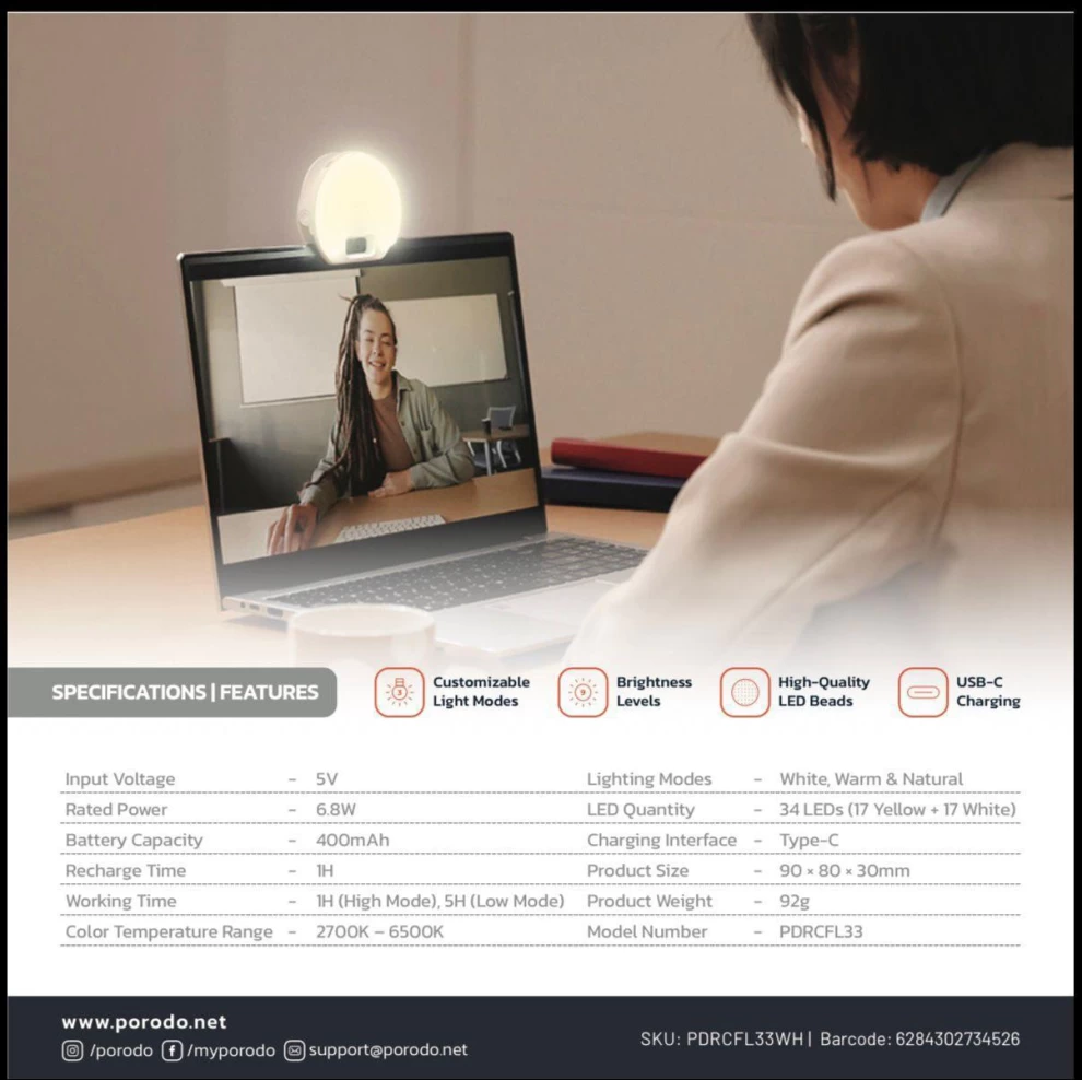 حسّن جودة الصور ومقاطع الفيديو ومكالمات الفيديو مع إضاءة Porodo GlowRing المحمولة. تتميز بتصميم قابل للتثبيت بالمشبك مع مستويات سطوع قابلة للتعديل، لتوفير إضاءة ناعمة ومتوازنة مثالية لصنّاع المحتوى والسيلفي والاجتماعات عبر الإنترنت.