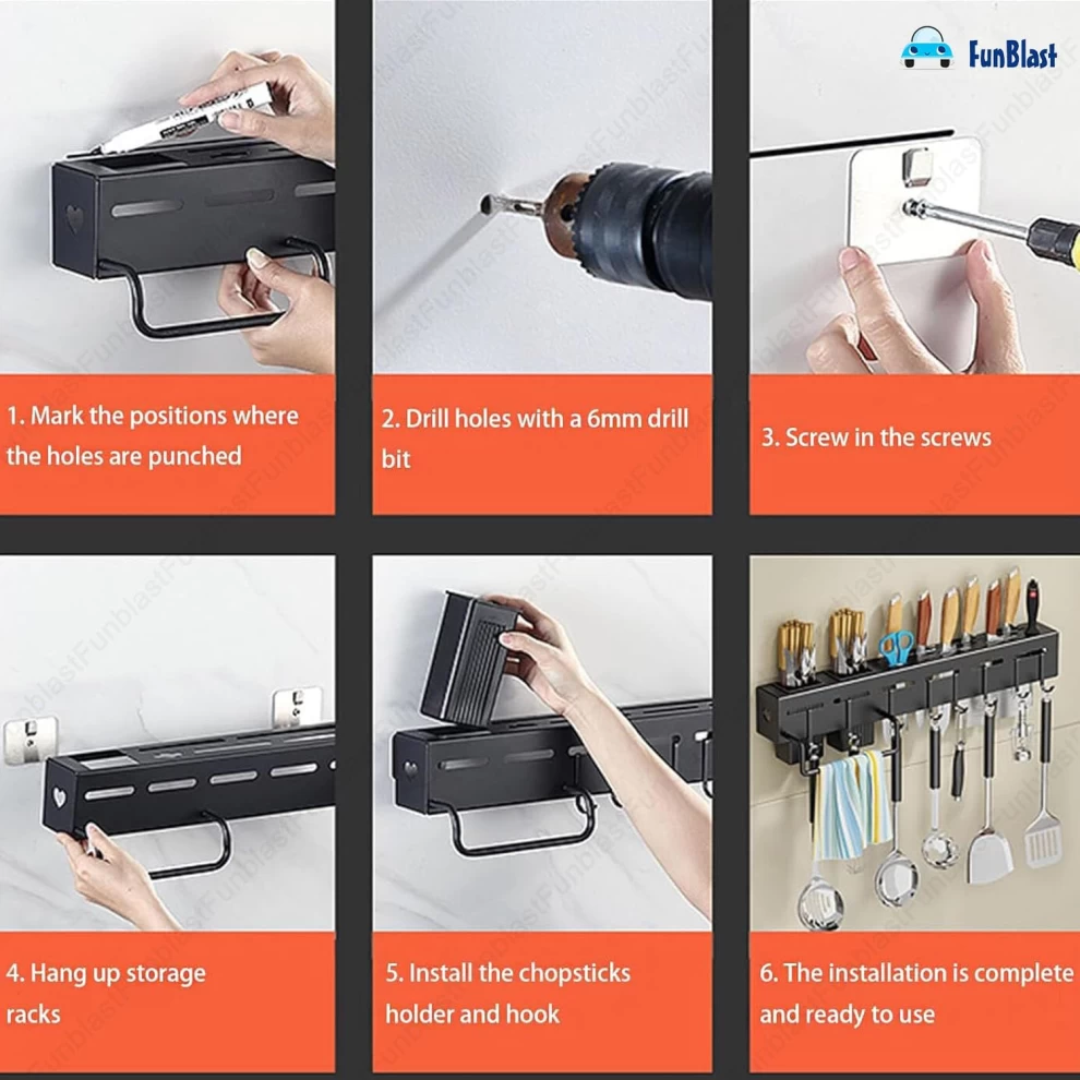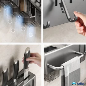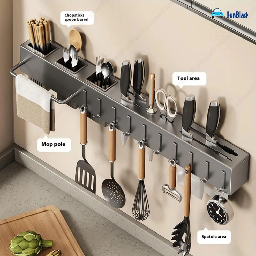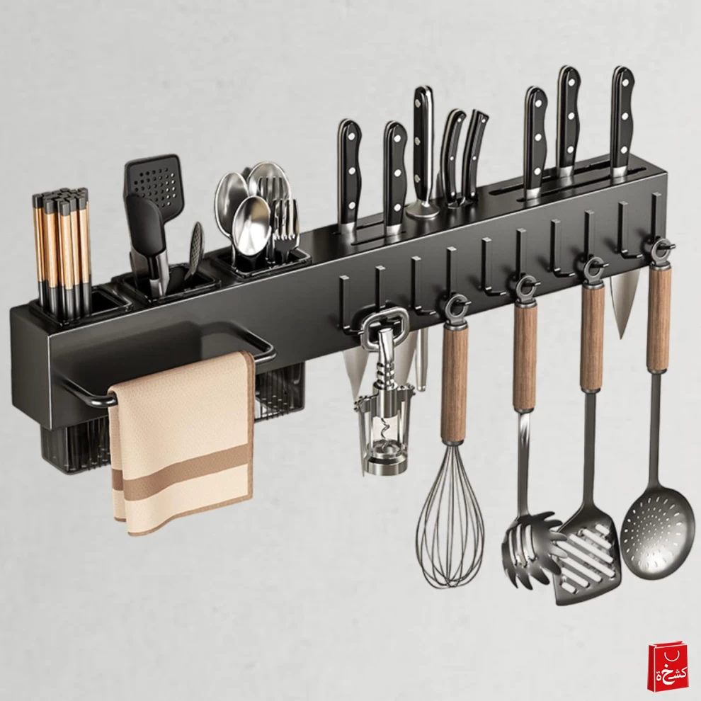 يتميز بـ خطافات لتعليق الملاعق والمغارف، حامل مناشف، ورف علوي بتصميم عصري معلق يساعدك على ترتيب مطبخك بطريقة عملية وأنيقة.