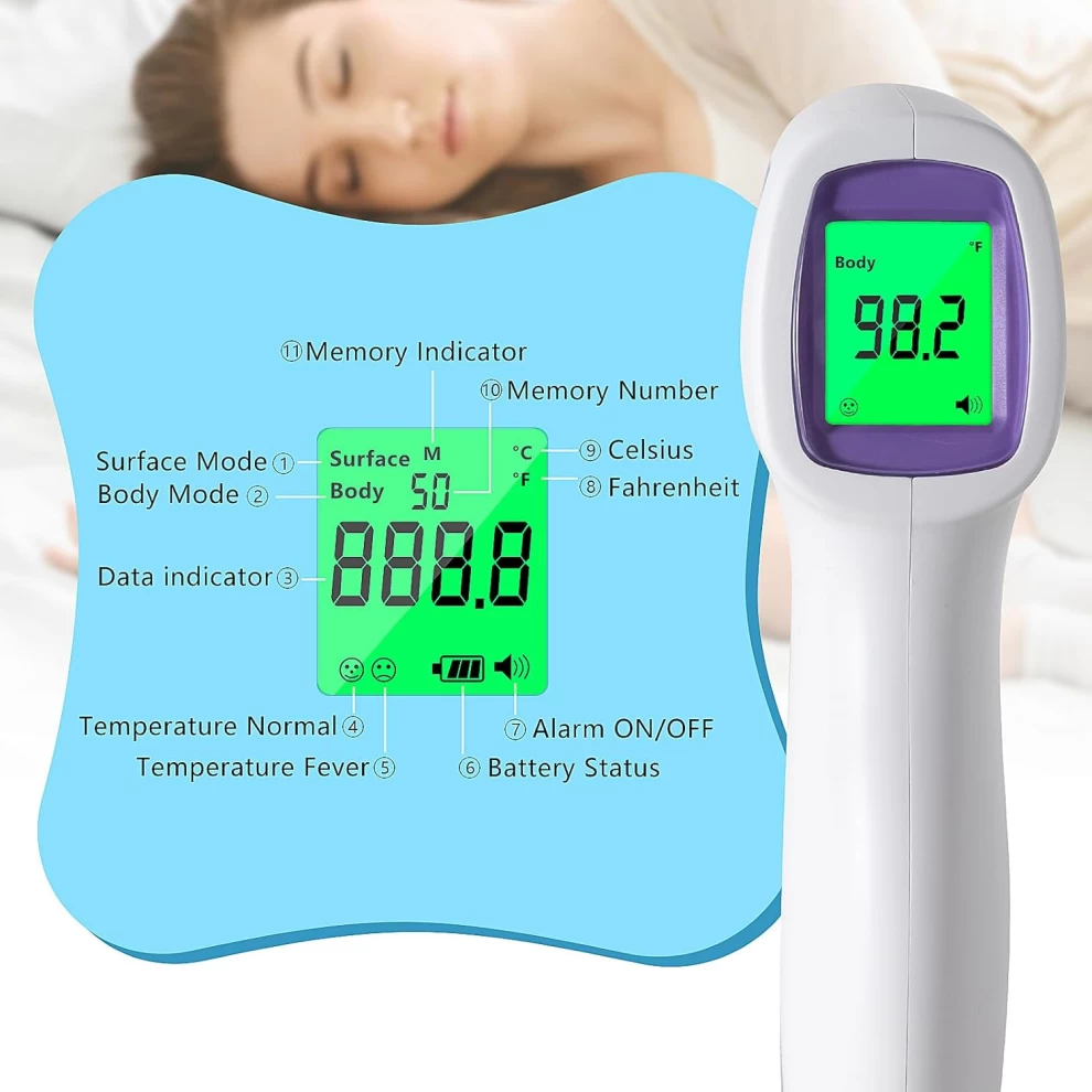 • Fever Alert with Backlight: The larger LCD backlit screen has 3 backlit indicators (green/yellow/red). When abnormal temperature occurs, it will be accompanied by a warning sound. The backlit digital LCD display is bright enough for use in dimly lit rooms.