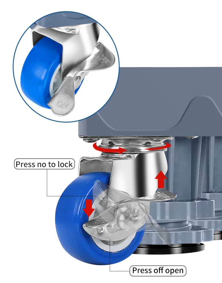 • 🔘 Design: 4 lockable wheels + 8 stable lifting feet