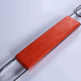 Adjustable design accommodates foods of various thicknesses and easily flips over. Long wood handle keeps hands safely away from heat