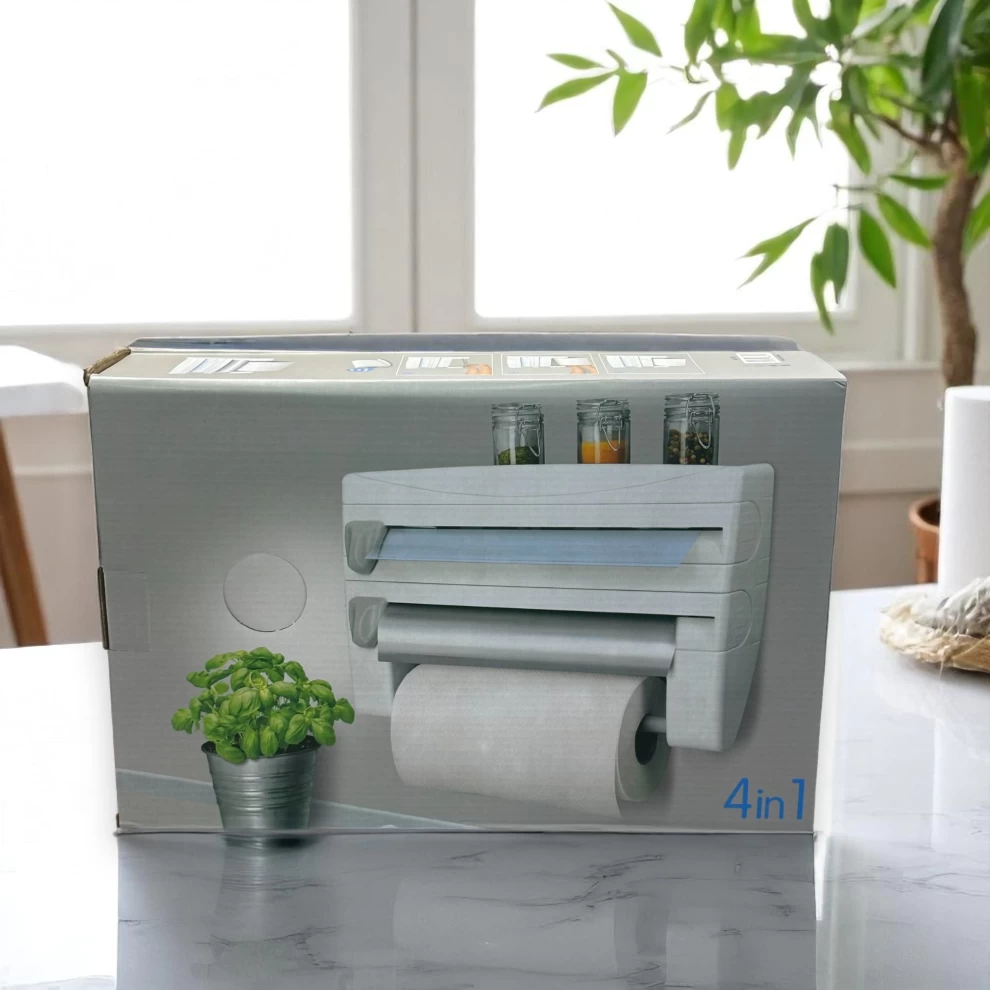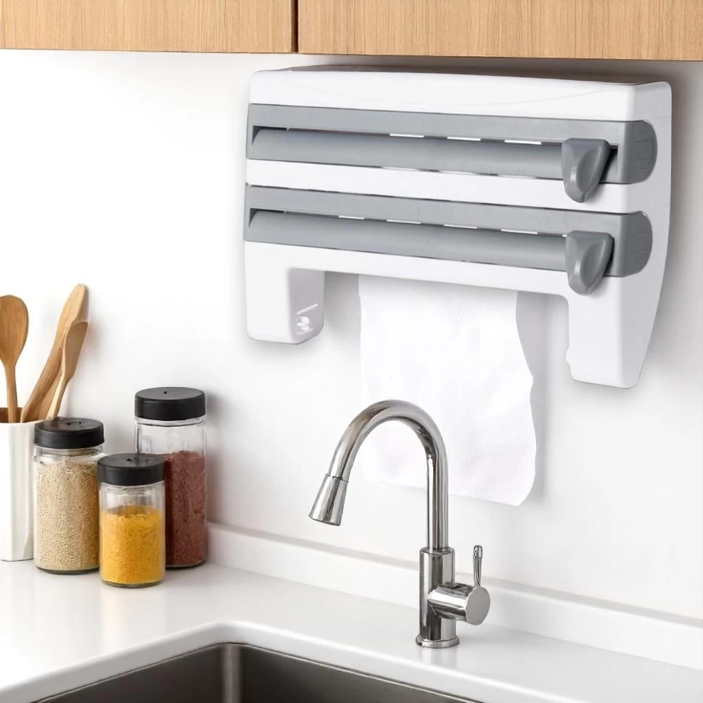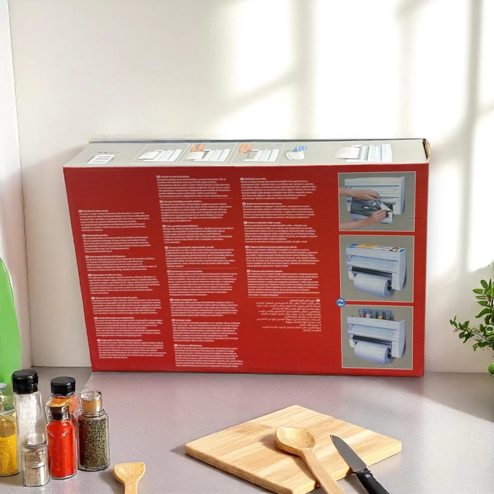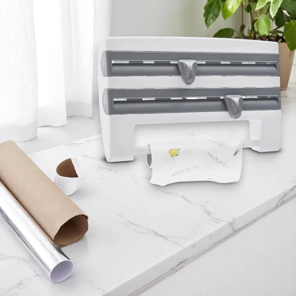 • 🧻 3-in-1 Convenience – Holds paper towel, foil, and cling film in one dispenser