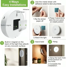 • Simple to install, no hard-wiring. Simply use the super-strong 3M double-sided adhesive pads or stick to any metal surface with the built-in magnet,Works great indoor and outdoor, especially as a night light for stairs, steps, wardrobe, hallways, dark closets & cabinets.