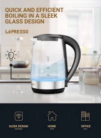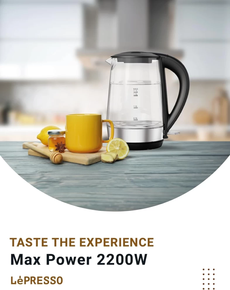 Upgrade your kitchen with the LePresso 360 Transparent Quick-Boil Glass Kettle – a stylish and efficient kettle that boils water in minutes. With its premium glass body, 360° swivel base, and quick-boil technology, it’s perfect for tea, coffee, instant meals, or daily use. Designed for safety, convenience, and elegance, this kettle is ideal for homes, offices, and dorms.
