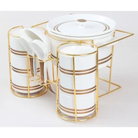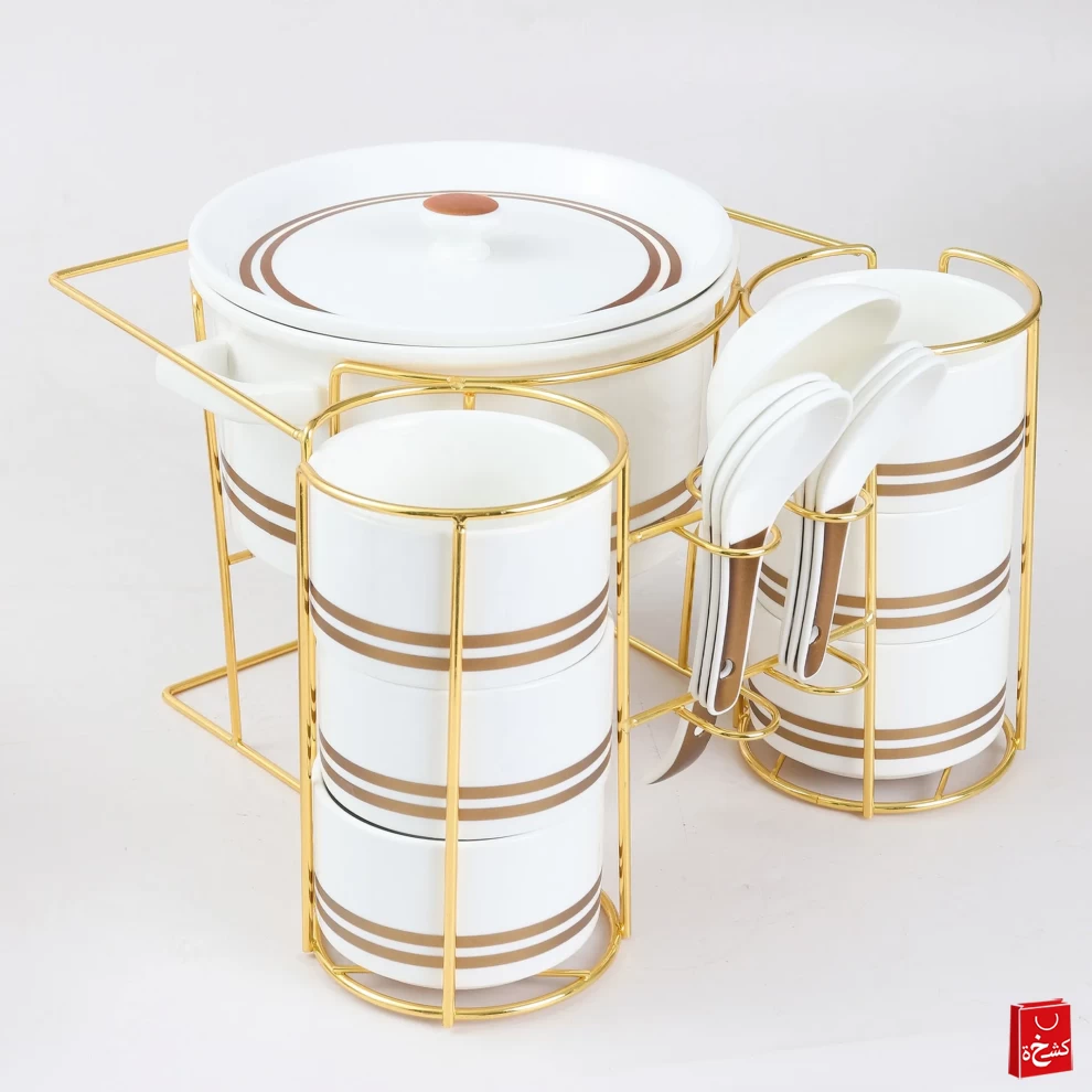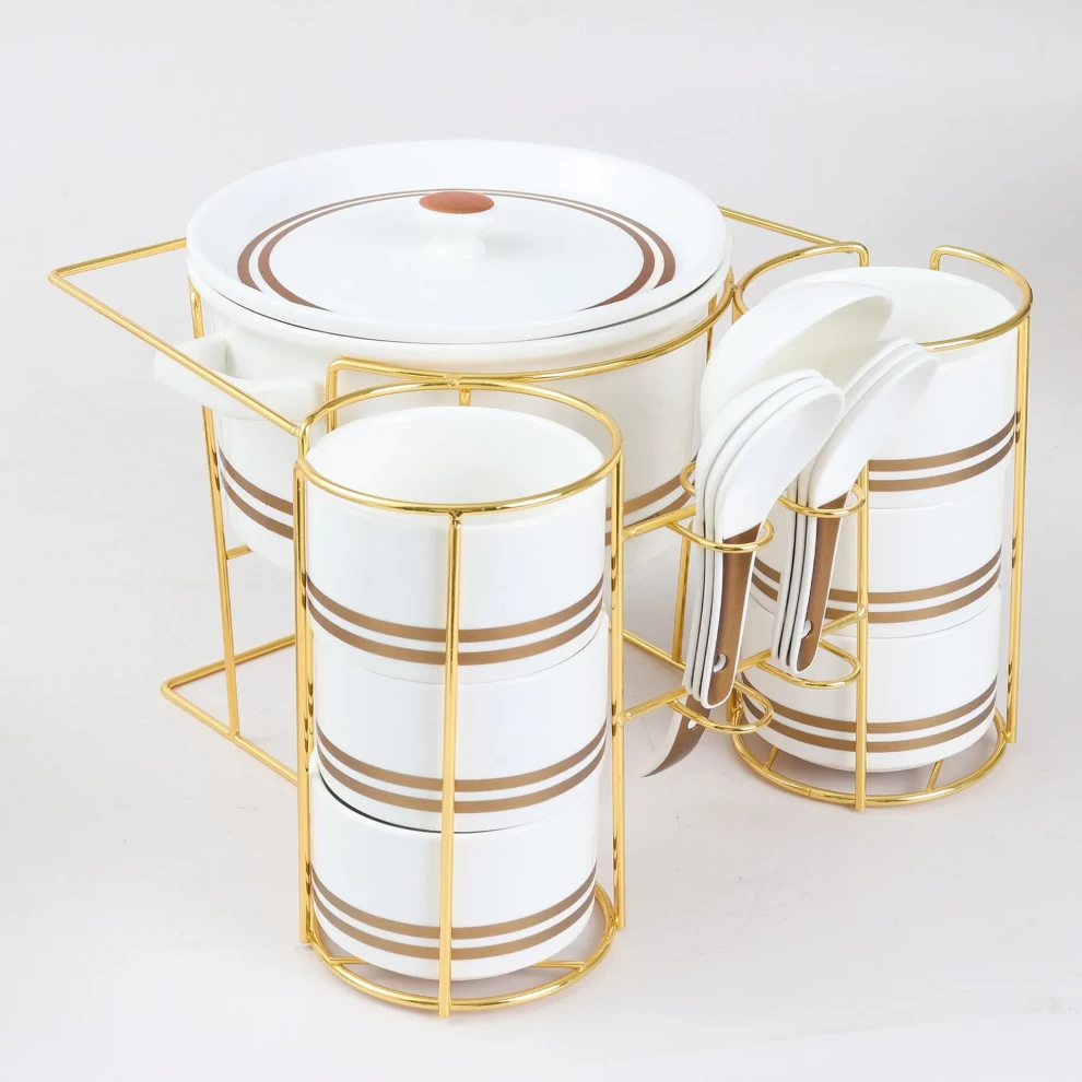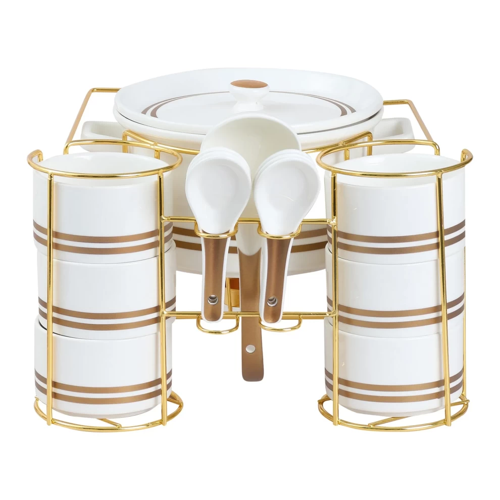 Serve in style with the Orchid Ceramic Soup Set. This elegant 15-piece set, finished in gold accents, combines functionality with luxury. Perfect for family meals, parties, or special occasions, it includes everything you need to serve soups and broths elegantly on a stylish stand.